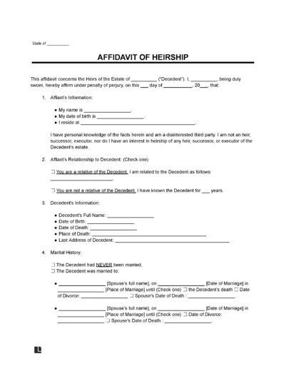 Filling out and creating an affidavit of heirship requires entering information about the deceased and their family or spouse. A third party who does not benefit from the inheritance creates this document. Write an effective affidavit with the following steps.