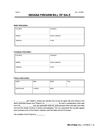 An Indiana Firearm Bill of Sale is a document that proves a gun sale took place. It contains signatures from the seller and buyer, along with any witnesses to the sale. Although Indiana doesn’t legally require this document, it can serve as a receipt and protect the legal rights of both parties.