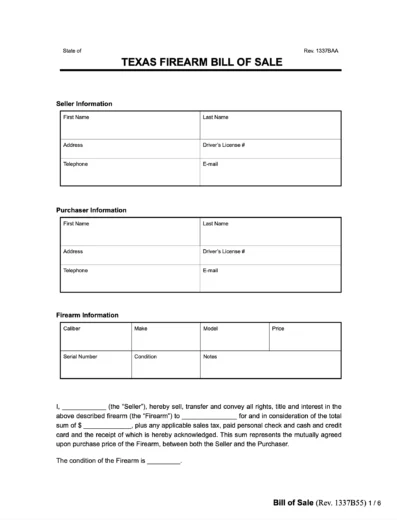 Although Texas laws do not mandate using a firearm bill of sale to record the transfer of firearm ownership from one party to another, it is recommended. The bill of sale captures the seller and buyer details, the firearm description, and the purchase information.