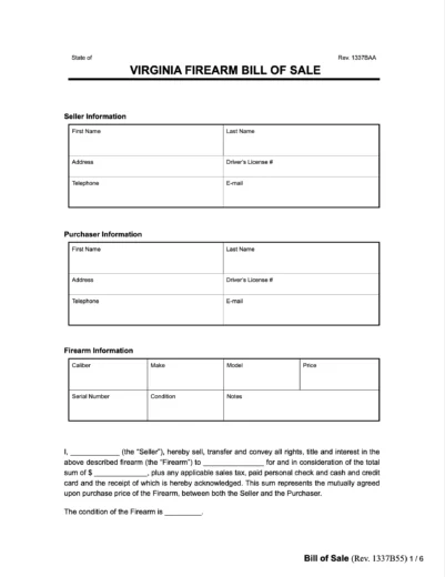 A Virginia firearm bill of sale records a private firearm sale. Buyers and sellers can use it to record gun transactions and protect themselves from fraud. This document contains details about the seller, the buyer, and the gun transferred.