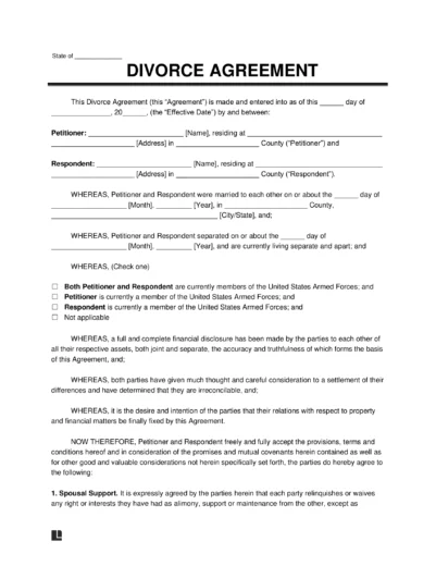 A divorce agreement or divorce settlement agreement is a binding contract that describes the rights and duties of spouses dissolving their marriage. Spouses write it together to settle divorce terms without relying on a court ruling. They use it to agree on property distribution, spousal support, and child custody.