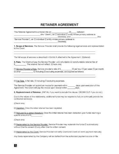 Retainer agreements are a type of service agreement. Terms vary depending on the types of services offered and the payment method. The three primary types of retainer include: