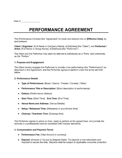 View an example of a performance agreement contract to see how to summarize the terms and conditions of a live show. Use Legal Templates’s guided form to customize your own and download a copy in PDF or Word format.