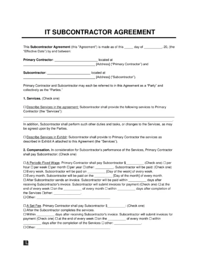 - Payment terms. Outline the agreed-upon compensation and payment schedule for the IT subcontractor’s services.