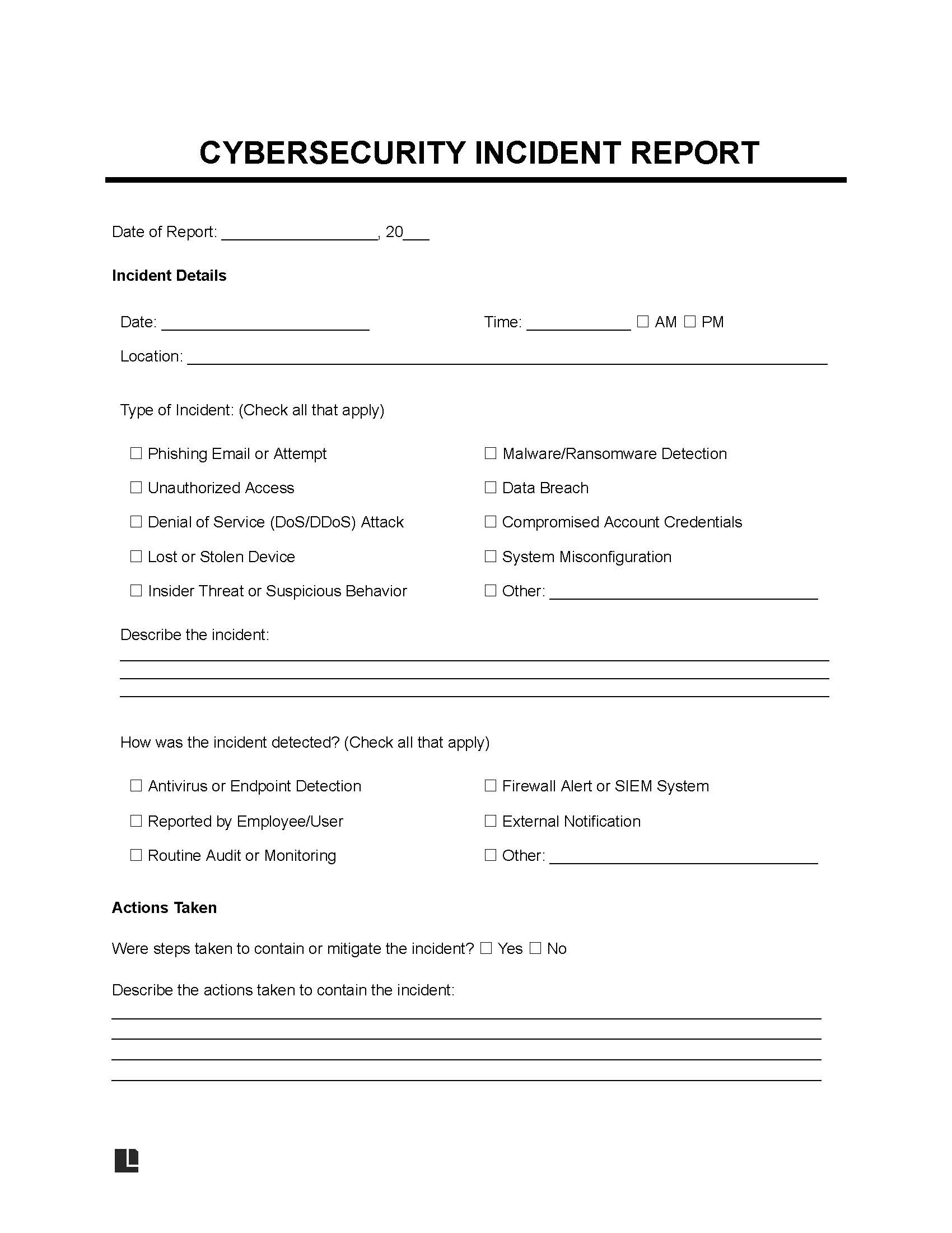Every second counts during a cybersecurity incident. Legal Templates provides a ready-to-use cybersecurity incident report template to document threats, support your incident response, and meet regulatory compliance needs. Use the form to capture key details, coordinate your security team, and take control of the situation before it escalates.