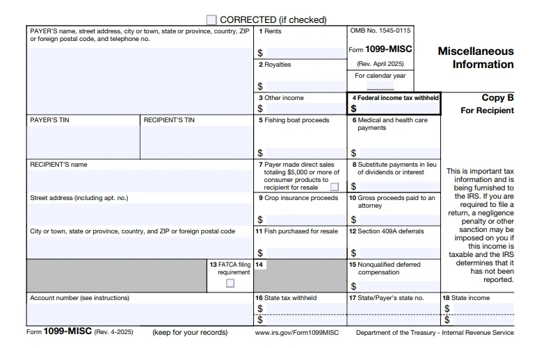 The only change to the 2025 version of Form 1099-MISC is the removal of Box 14, which was previously used to report excess golden parachute payments. Now, Box 14 on Form 1099-MISC is labeled as “Reserved for future use.” You can now report excess golden parachute payments on Box 3 of Form 1099-NEC instead.