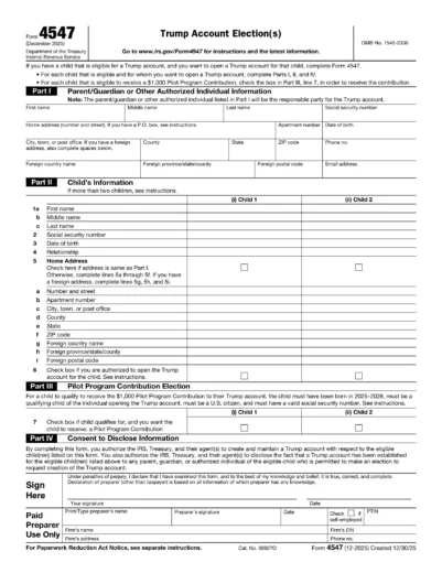 Filling out Parts I, II, and IV of Form 4547 lets you open a Trump account for an eligible child. You can also complete Part III of the form to elect to receive the pilot program contribution or skip it if your child doesn’t qualify. Review these Form 4547 instructions below to get started.