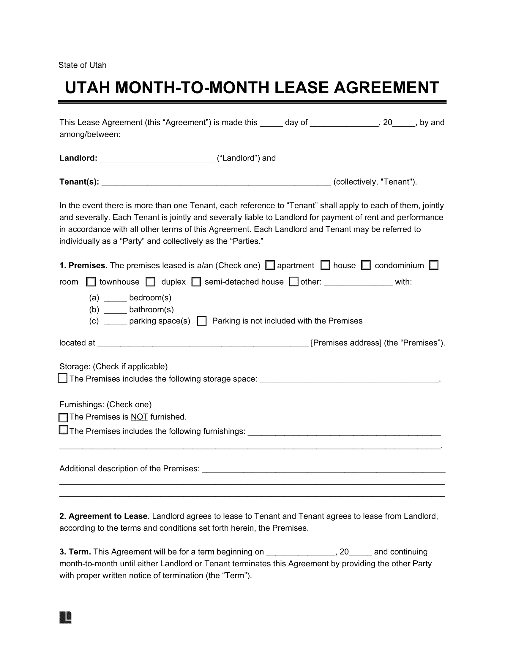 - Minimum Termination Period: Under Utah state law, a landlord must provide at least 15 days’ notice before they end a month-to-month lease. [1] Utah doesn’t specify a minimum notice period for tenants to terminate a lease, but it’s customary for them to still provide at least 15 days.