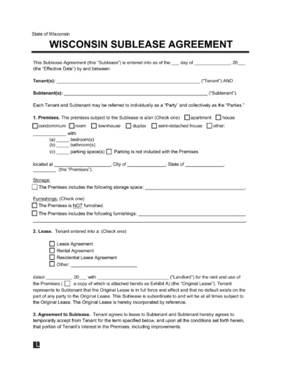 A Wisconsin sublease agreement is a contract that allows an original tenant (or “sublessor”) to rent out a residential property that they’re already renting to a new tenant (or “sublessee”). A sublease agreement must comply with the lease and cannot conflict its terms. The original tenant is still responsible for paying the landlord on time and remains bound under the lease.