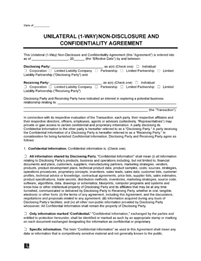 You can download a unilateral (one-way) non-disclosure agreement template below in PDF or Word format.