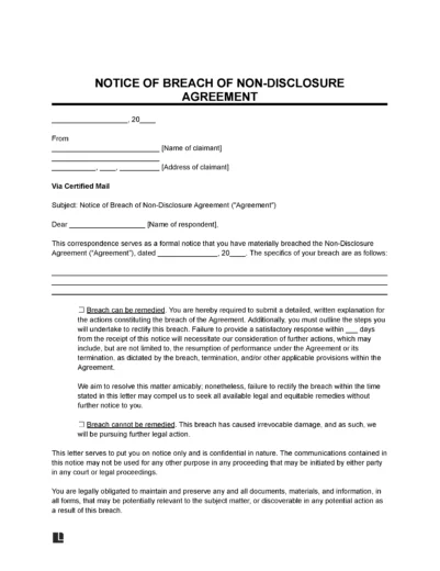 Legal Templates’s free notice of a breach of a non-disclosure agreement helps you address and stop individuals who violate the terms of their contract. Use our customizable notice, available in PDF and Word format.