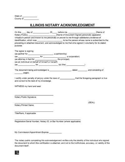 An Illinois notary acknowledgment form is a legal tool used by a notary public to authenticate a signature on a document, certify signature authenticity, and verify the signer’s identity. Once all notarial duties are satisfied, the notary executes the certificate, and the document is considered notarized.