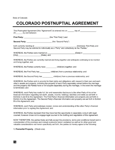 Below, you can see what a Colorado postnuptial agreement looks like. When you’re ready, use our document editor to customize this template to meet your needs. Download the final version in PDF or Word format.