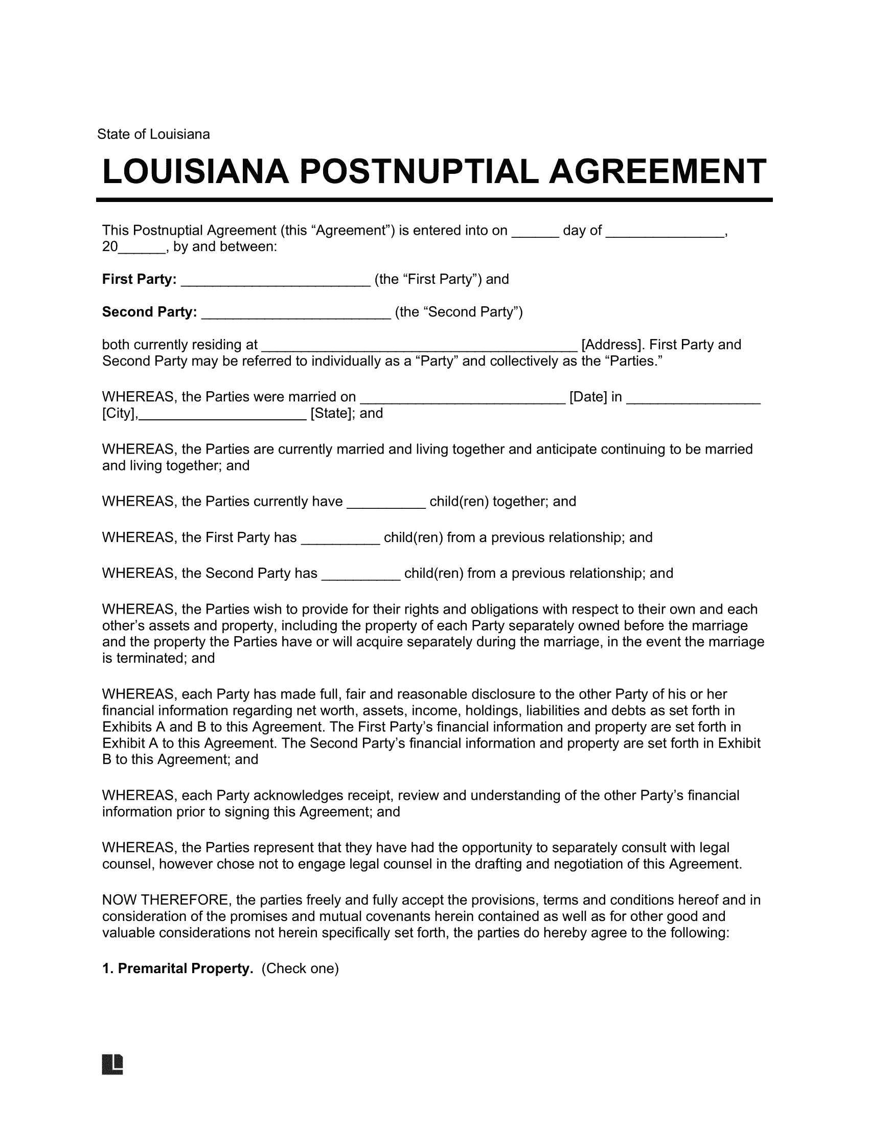View a free Louisiana postnuptial agreement template to understand what it looks like. Then, create your own using our document builder. Download it in PDF or Word format.