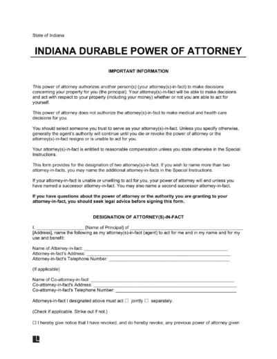 An Indiana durable power of attorney form is a legal document that allows an individual (“the principal”) to designate another person (“the agent”) to make decisions on their behalf. Under state law, the agent can primarily make financial decisions during the principal’s lifetime and in case they become incapacitated.