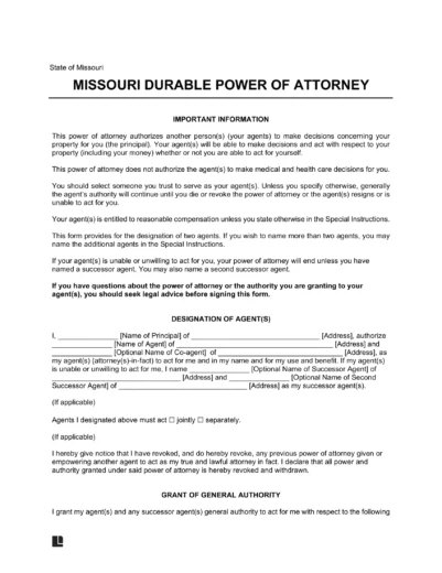 A Missouri durable power of attorney form is a legal document that authorizes an individual (the “agent”) to make financial decisions and take actions on behalf of another person (the “principal”) within the state of Missouri.