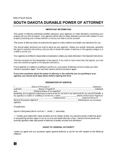 A South Dakota durable power of attorney form lets a principal appoint a trusted agent to manage their financial matters. Because this form remains effective through the principal’s incapacity, they must choose a trusted agent and grant them appropriate control.