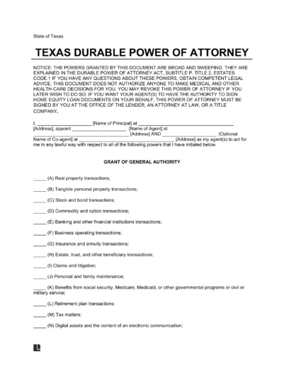 A Texas durable power of attorney form appoints an agent to represent the principal’s financial interests. The agent’s decisions have the same legal weight as if the principal made them personally.