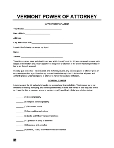 This form of delegation becomes void if you become incapacitated. If someone desires their appointed authority to continue even during incapacitation, they should opt for the Vermont durable power of attorney, which remains in effect under such circumstances.