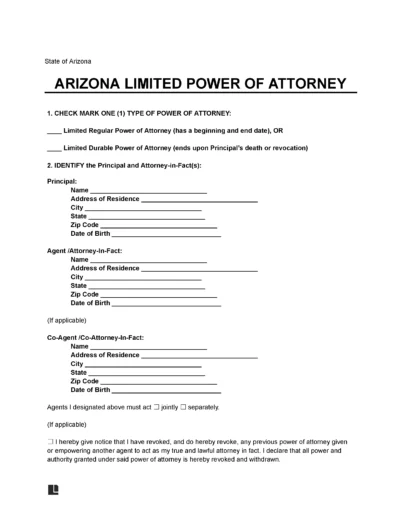 An Arizona limited power of attorney is a legal document that grants another person (“agent” or “attorney-in-fact”) the authority to act on behalf of the principal for defined purposes or a limited time.