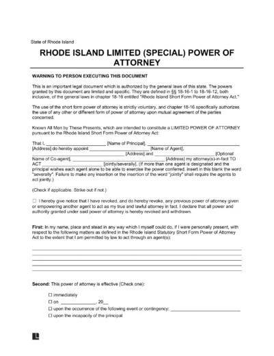 A Rhode Island limited power of attorney lets a principal delegate specific authority to another individual for predetermined matters. This legal document pertains to financial affairs and real estate transactions, authorizing the agent to act on the principal’s behalf for tasks like investing, asset management, and business transactions.