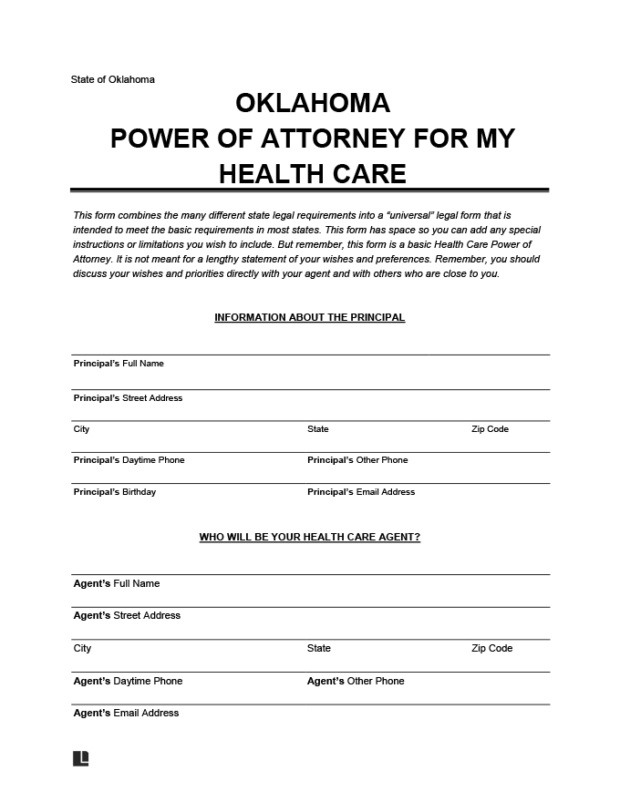 An Oklahoma medical power of attorney lets you choose an agent to make healthcare decisions if you become unable to make decisions for yourself. This document ensures an agent can carry out your preferences even if you cannot communicate when you’re sick or disabled. In Oklahoma, this document is also called a durable power of attorney for health care.