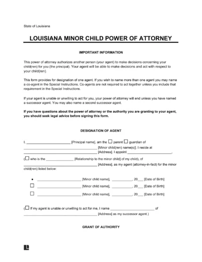 A Louisiana minor power of attorney, also known as Provisional Custody by Mandate, allows parents to temporarily grant another person authority to make decisions regarding their child’s welfare.