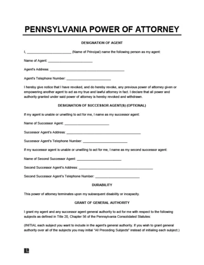 A Pennsylvania power of attorney (POA) is a legal document that allows you to appoint another person you trust (your agent) to make decisions on your behalf.