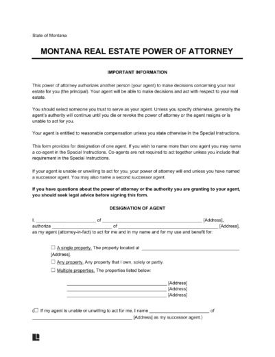 A Montana real estate power of attorney is a legal document appointing an agent, or “attorney-in-fact,” to handle real estate transactions on behalf of the principal. This includes buying, selling, leasing, and managing residential or commercial properties.