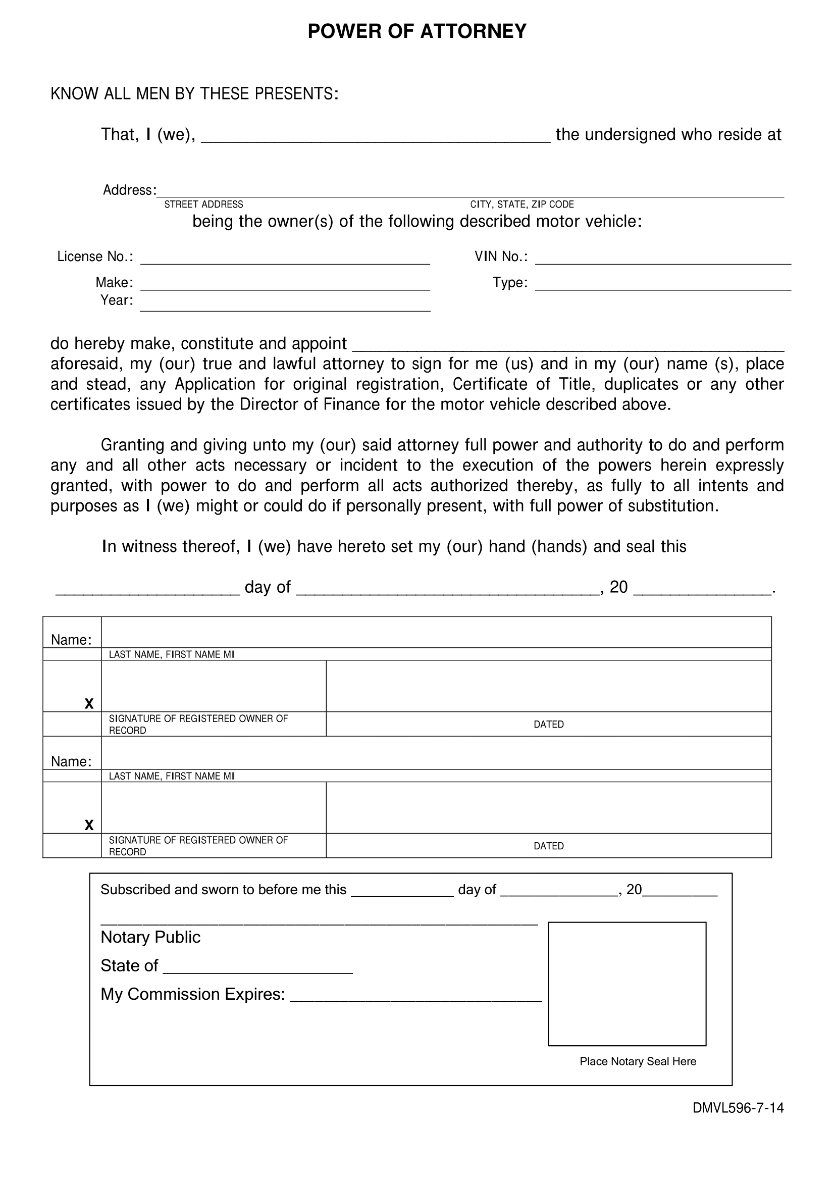 A Hawaii motor vehicle power of attorney (Form DMVL596-7-14) is a legal document enabling a vehicle owner, known as the principal, to designate an agent or attorney-in-fact for the purpose of handling specific motor vehicle-related responsibilities, such as selling, purchasing, titling, or registering a car or truck.