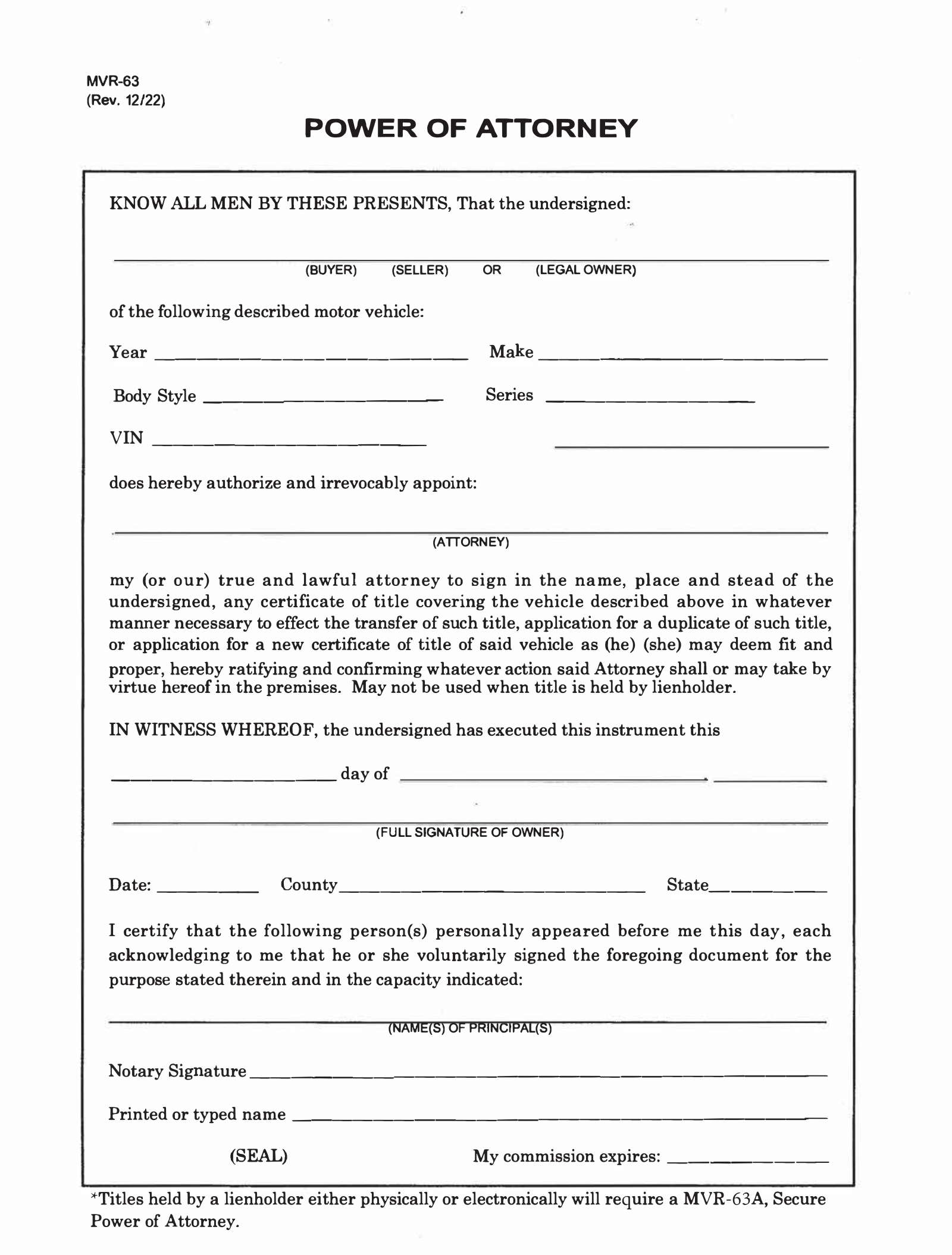 Once completed, signed, and notarized, this form provides official proof that the agent is empowered to handle tasks like vehicle registration and titling on behalf of the principal without requiring the vehicle owner’s direct involvement. The powers granted are limited strictly to the duties specified in the form.