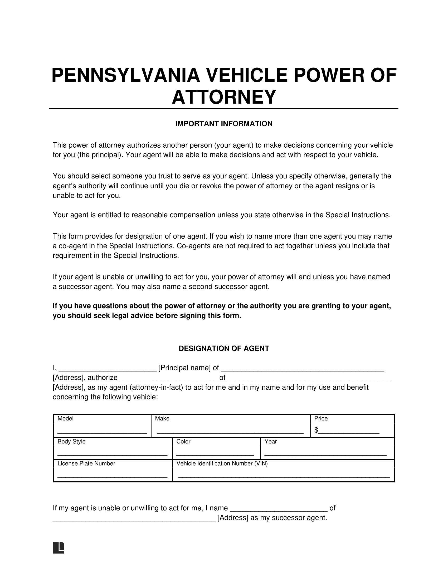 A Pennsylvania motor vehicle power of attorney form is a document that designates an agent to manage tasks related to a vehicle on behalf of the owner with the Pennsylvania Department of Transportation. This authorization enables the agent to perform functions like registration, titling, and other DMV-related activities for one specified vehicle.