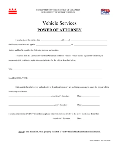 A Washington, DC motor vehicle power of attorney (Form DMV-VSPA-01) grants an individual, known as the principal, the authority to designate an agent or attorney-in-fact for managing vehicle registration, titling, or other related affairs.