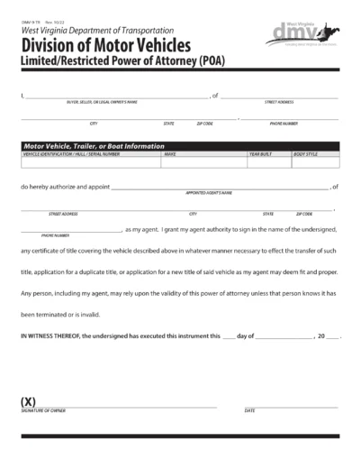 A West Virginia motor vehicle power of attorney (Form DMV-9-TR) is a legal document allowing a vehicle owner to delegate specific tasks to a trusted agent (or “attorney-in-fact”). When the vehicle owner is unavailable, the agent can apply for a new or duplicate title, transfer a title, and complete other administrative tasks on the vehicle owner’s behalf.